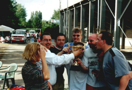 Kerstin, Stefan, Manni, Mike, Andi P., Holger Dietz, Andi S. und Kai bei der Entjungferung des Fairplaypokals ( AK-Turnier Kleinfeldmeisterschaft 2000 )