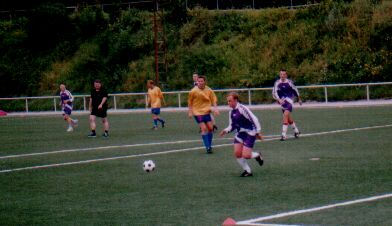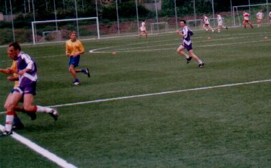 AK-Tunier am 14.7.2001, links Sascha Wrobel und rechts hinten M.. Greisert in Aktion gegen die Mannschaft Rote Karte