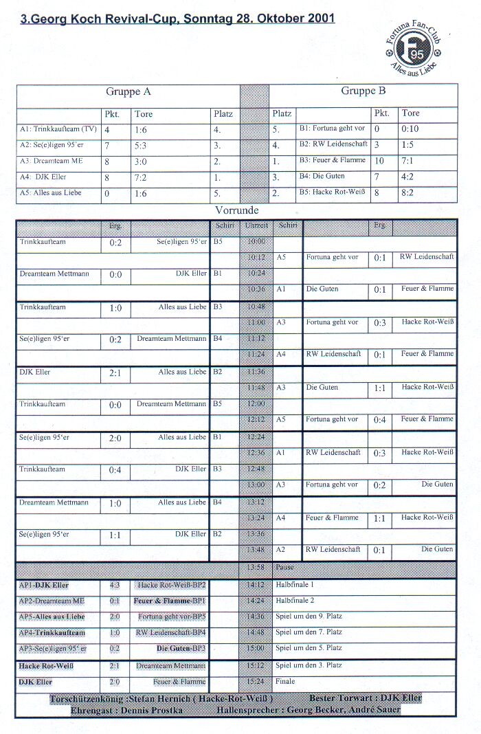 - VfB Stuttgart Fan-Club Stromberg 0-2 - FFC Ratingen 0-0 - Underground 0-2 - Viertelfinale - 08/15 Trinkkaufteam 0-0 1-2 nach Siebenmeterschießen ( Matzat ) - Play Down - Fortuna Junkies 2-0 ( Sievers 2x ) - Spiel um Platz 5 - FFC Ratingen 1-2 ( Paul )